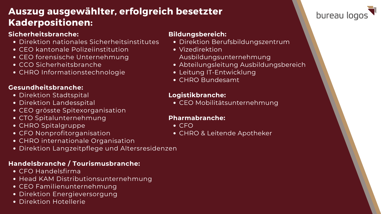 Bureau Logos AG ist die erste Adresse für die Suche und Auswahl von Kaderpersönlichkeiten auf oberster Managementstufe. Unser Leistungsausweis umfasst alle Branchen. Schweizweit, und im gesamten europäischen Wirtschaftsraum identifizieren und gewinnen wir geeignete Persönlichkeiten. Dazu nutzen wir unser Netzwerk und unsere Datenbank.